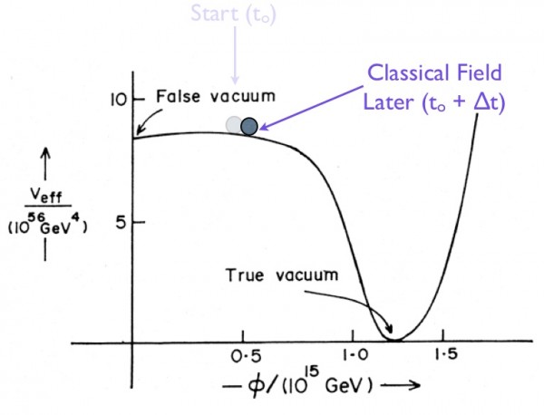 Según este boceto matemático en el principio era el potencial, todo era potencial y en el potencial se encontraba todo. Y dicho potencial era realmente enorme (lo que viene esquematizado con la altura que alcanza la curva de la gráfica de arriba). En cierto momento ese potencial (lo que podía ser), realmente comenzó a ser (cambió). Eso se identifica arriba con un desplazamiento gradual muyyyy lento hacia la derecha de la bolita dibujada. Durante este desplazamiento la nada cuántica crece (se infla como un globo), pero permanece aún "fría" y carente de cualquier otra sustancia. Transcurridos unas pocas millonésimas de segundo, el globo ha crecido exponencialmente (se ha extendido) no menos de 60 órdenes de magnitud.