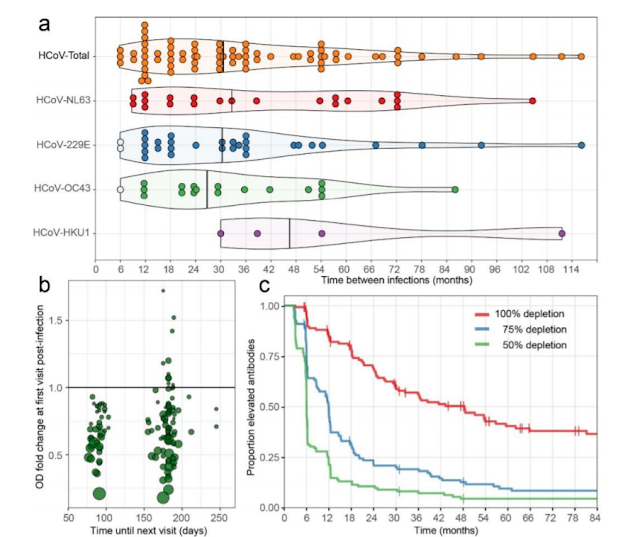 Figura 2. Características de infección y reinfección, y dinámica de anticuerpos menguantes para coronavirus estacionales. (a) El intervalo de tiempo entre reinfecciones. Los puntos blancos indican reinfecciones para las cuales no se pudo observar una disminución intermedia en los niveles de anticuerpos. Las líneas verticales negras describen los tiempos medios de reinfección. (b) Cambios en los niveles de anticuerpos después de la infección en relación con la duración del intervalo de seguimiento. Cada círculo representa una infección. El eje x describe el tiempo hasta la próxima visita de seguimiento posterior a la infección. El eje y describe el cambio en el nivel de anticuerpos en la visita posterior. Los círculos más grandes representan una mayor relación de aumento en los niveles de anticuerpos en la infección inicial. La línea horizontal indica el límite entre aumentos (> 1.0) o disminuciones (< 1.0) en los niveles de anticuerpos en la próxima visita de estudio. (c) Curva de Kaplan-Meier que muestra disminución de anticuerpos después de la infección (100%, 75% y 50%), detalles en M&M.