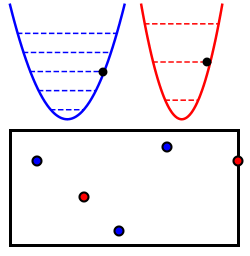 - El primer sistema de la imagen está formado por dos osciladores armónicos cuánticos vibrando con distintas frecuencias (ωrojo > ωazul).