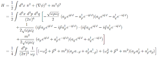 Imagina que un cuarto de tu casa de volumen V, y tamaño LxLxL, está relleno de una especie de campo invisible. Cada punto infinitesimal del cuarto poseerá así un valor real relacionado con la energía que contiene ese minúsculo punto del espacio. Para conocer la suma de la energía total en el cuarto (el Hamiltoniano H), si se trata de un campo escalar libre (sin interacciones ni acoplamientos entre los osciladores), todo se resume a la energía cinética (al momento p en realidad) de cada pequeño lugar del cuarto. Pero como trabajamos con partículas minúsculas capaces de alcanzar velocidades cercanas a la de la luz, debemos mezclar relatividad especial y mecánica cuántica. Esto hace que la energía contenida en un espacio infinitesimal del cuarto venga expresada matemáticamente por el equivalente de una especie de superposición de todos los estados posibles k (o p) para un oscilador armónico simple colocado en ese lugar dx, teniendo en cuenta además que cada estado posible k(o p) va a poseer una serie n (n=1,2,3...) de estados de excitación posibles (interpretado directamente con el número de partículas n que hay en esa posición).