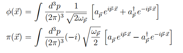 de manera que si sustituimos de esta manera y hacemos además k = p podemos expresar el campo y su conjugado (derivando el campo escalar sobre el tiempo) como: