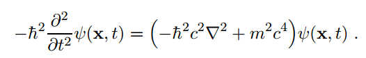 Esta es la ecuación denominada Klein-Gordon siendo de segundo orden tanto espacial como temporalmente presentando la deseada simetría espacio-temporal de la relatividad.