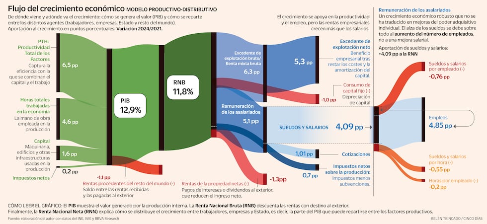 La economía española creció entre 2021 y 2024 un 12,9% en términos reales. Es decir, el PIB en España a finales de 2024 era un 12,9% superior al que disfrutábamos al acabar 2021. Sin embargo, que no exista una sensación generalizada de mejora, en especial entre trabajadores, puede resultar razonable si entendemos cómo se genera este PIB y, sobre todo, a quiénes y cómo remunera tal crecimiento.
