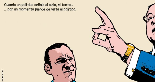 Pasa igual en los triles: te dicen que te fijes en la bolita y tú te fijas, pero te timan igual. El necio no es el que mira el dedo, es el que mira lo que le señalan. Viñeta de Ernesto Rodera en el diario ADN (Entradilla de: