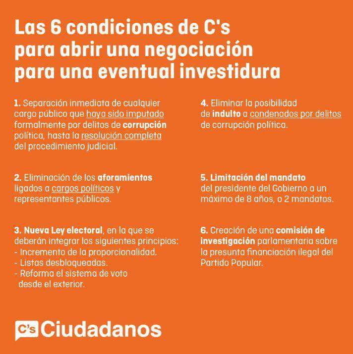 Ya sé que todos los medios de comunicación titulan "Rivera dará el sí con estas seis condiciones", pero teniendo un poco de criterio propio y escuchando directamente las fuentes, como el discurso de Rivera, te das cuenta que en todo momento esas 6 condiciones han sido definidas como la LLAVE de la negociación. No son la BASE de la negociación.
