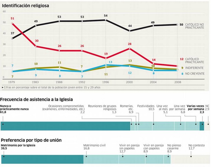 El resumen es que en contra de lo que habitualmente se dice el fervor religioso en España está en plena decadencia y ya no puede considerarse un país católico del rango de Irlanda, Italia o Portugal países (sobre todo los dos últimos) en los que la religión todavía tiene mucho peso. Y eso teniendo en cuenta que son datos sin segmentar en los que influye todavía mucho el peso de la tercera edad que vivió y creció en una España que sí era muy religiosa.