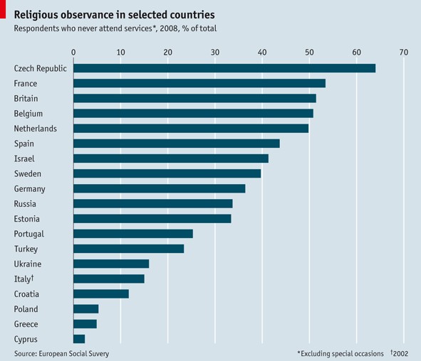 1) Porcentaje de población que nunca acudió (en 2008) a una iglesia por motivos religiosos (excluyendo bodas, funerales y demás ocasiones especiales). España está cerca del 45% y supera a países supuestamente menos religiosos como Alemania o Suecia. Por poner un ejemplo de contraste respecto a un país similar que sigue siendo muy creyente lo tenemos en Italia, sólo el 15% de la población no fue a la iglesia en alguna ocasión. Un país históricamente muy alejado del fervor religioso como Francia únicamente sobre el 55%, estamos mucho más cerca de Francia que de Italia en ese sentido.
